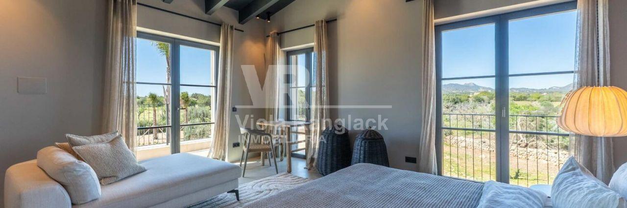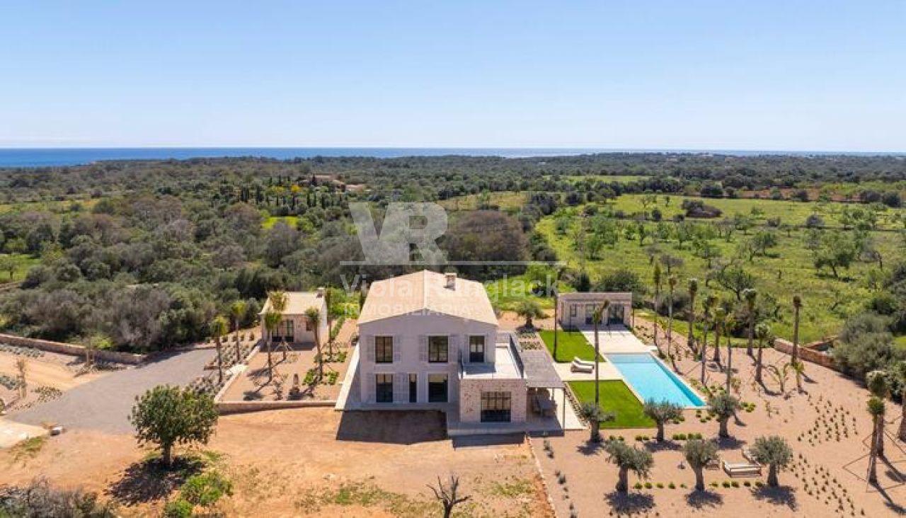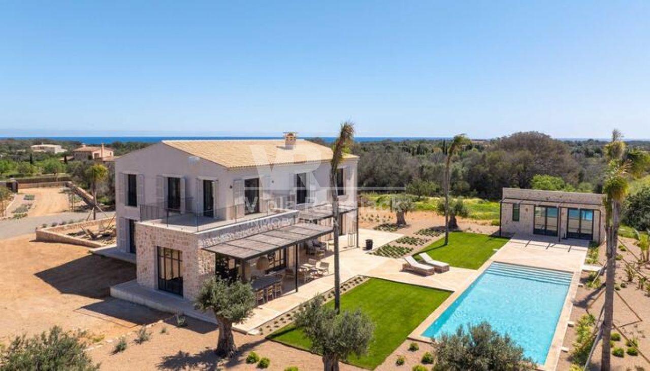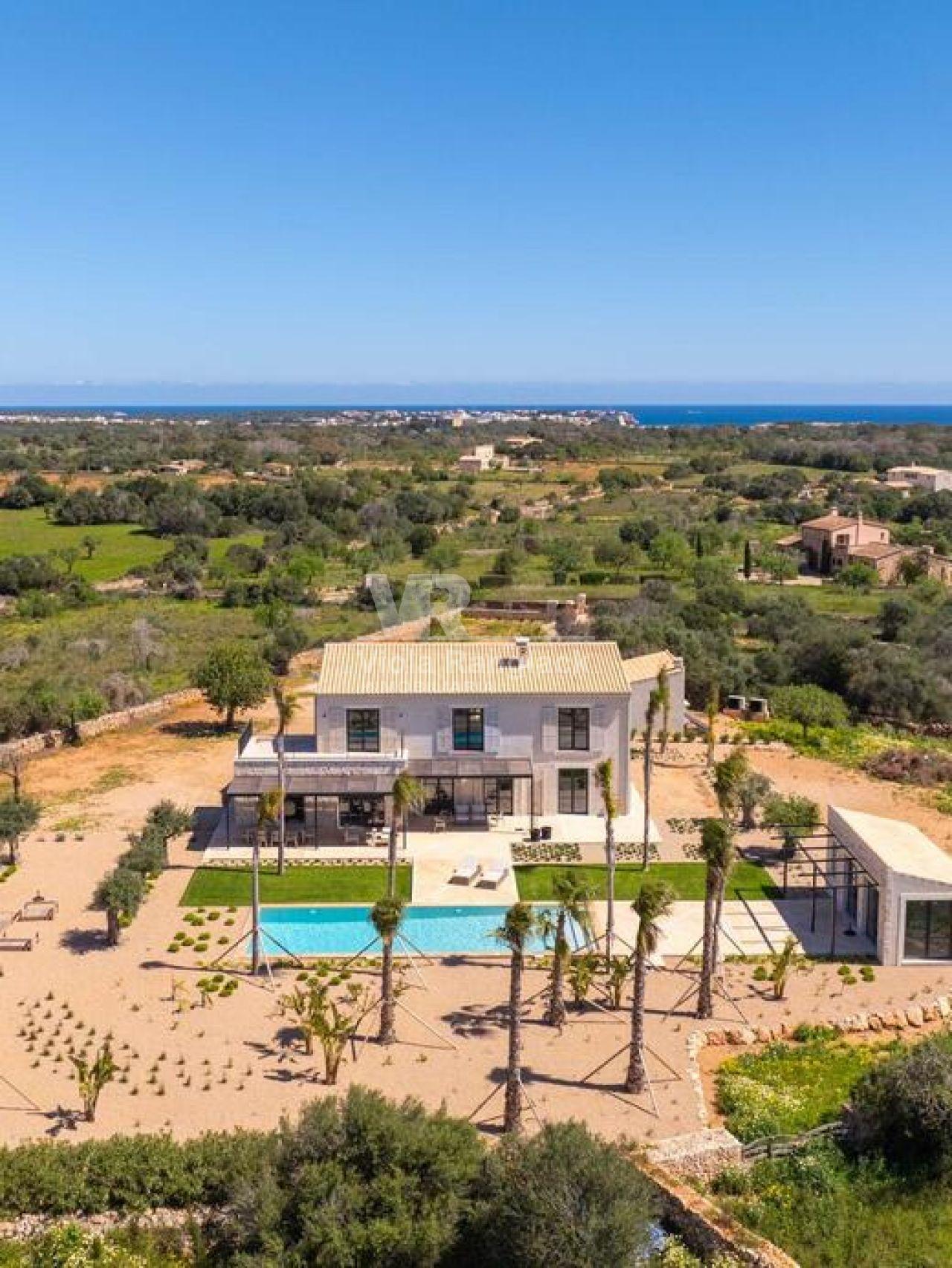 Diese moderne Finca im Südosten Mallorcas verbindet zeitgenössische Architektur mit mallorquinischen Akzenten und bietet auf ca. 381 m² Wohnfläche und einem Grundstück von 28.000 m² eleganten Wohnkomfort. Der offene Wohn- und Essbereich mit einer hochwertigen Gaggenau-Küche und bodentiefen Fenstern sorgt für ein lichtdurchflutetes Ambiente. Das Anwesen umfasst vier Schlafzimmer, darunter eine großzügige Mastersuite, sowie einen ca. 70 m² großen Pool, ein Poolhaus und eine separate Casita. Der Außenbereich mit mediterranem Garten, Feuerstelle und teils überdachter Terrasse lädt zum Entspannen ein. Weitere Ausstattungsmerkmale sind Klimaanlage, Fußbodenheizung, Smart-Home-System, Solarpanele und ein automatisches Einfahrtstor. In ruhiger, naturnaher Lage bietet die Finca eine perfekte Mischung aus modernem Komfort und traditionellem Charme.